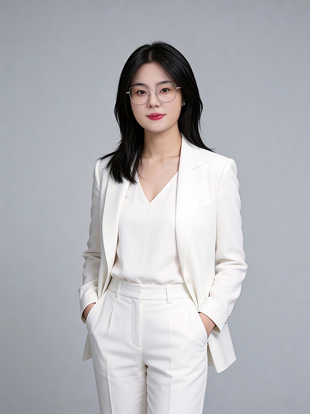 参考第一张图保留人物脸型、发型、年龄等特征生成职场形象照,参考第二张图人物占位和比例,采用标准焦段50mm,F/4光圈(处于F/2.8-F/4区间),平视视角(镜头与人物视线齐平);人物占画面70%,人物居中(居中构图),位于画面中心,为视觉聚焦点,入境范围头部及以下至臀部下方10cm(半身像);左右留少量背景空间;头部与画面顶部保留5%空间(头部发型完整呈现);原生肤质白皙细腻(通透自然),搭配韩式清透通勤妆(底妆轻薄整洁,浅淡暖调唇色提升气色,无浓重妆感);身着净白色西装外套(聚酯纤维材质)+同色系V领内搭+白色高腰西装裤(服装材质为聚酯纤维细腻挺括的西装面料,兼具柔和垂坠感与适度版型支撑力);发质柔顺,发丝光泽(呈微微自然蓬松);姿态优雅松弛:双手自然插入裤袋,身姿站立,肩部放松;唇角微微上扬(带浅淡笑意),眼神温和明亮并看向镜头,自带职场女性的专业与亲和感;画面整体简约高级,为专业棚拍人像写真,采用柔和自然布光,4800K中性光色温,面部光比精准控制1:1.3,面部光线均匀通透;主体锐利清晰,背景为极简纯中度灰色背景(光线呈现均匀柔和干净的质感),严格按照第一张图内容生成。详情
