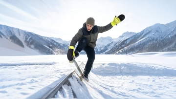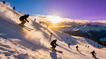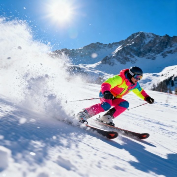 实景感与光影交织,滑雪者疾驰雪原,动感十足。大字风标语“让冬日飞扬!”搭配粒子飞溅效果,传递热血与酷炫的运动风,尽显冬日清爽与时尚张力。