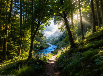 晨雾弥漫的湖畔,山影倒映水中,光影交织如梦似幻,水彩风与印象画派交融,营造静谧唯美的自然诗意。