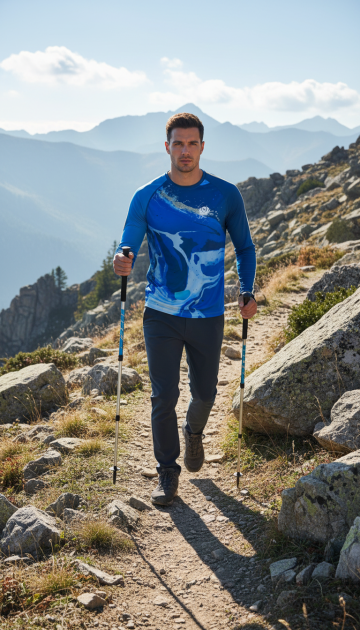 专业产品摄影风格,纯白色无缝背景,ISO 100,f/8光圈,柔和均匀的影棚灯光。画面左侧是一位金发白人男性徒步者,身穿橙色户外夹克、深灰色登山裤、棕色登山靴,背着黑色户外背包,手持图片中登山杖,侧身站立姿态自然。