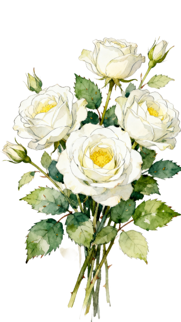 一束由多朵盛开的白色玫瑰花组成的垂直花束,搭配深浅不一的蓝色叶子和白色小花作为点缀,花朵层次分明,花瓣边缘柔和,花蕊呈黄色点缀着细小的红色斑点,整体构图呈现自然垂落的姿态,背景为纯白色,画面清新雅致,细节丰富,具有手绘插画的细腻质感和柔和色彩过渡。