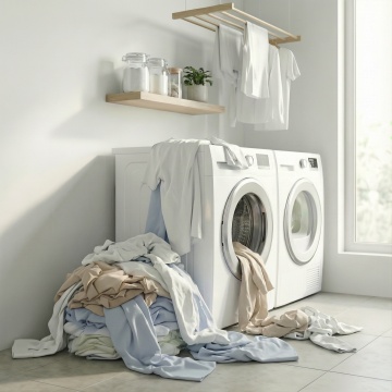 超写实风格白色滚筒洗衣机,银色金属质感圆形舱门,控制面板带旋钮和小型显示屏,顶部放置透明玻璃杯、米色按压瓶和棕色小瓶,左侧为装满白色毛巾的编织篮,旁边有绿色植物。柔和自然光从右侧照射,高光与阴影对比清晰,物体表面光滑反光。背景改为简洁的浅灰色水泥墙面,搭配木质搁板和白色收纳柜,地面为光滑白色瓷砖,整体营造现代简约、干净整洁的家居氛围。