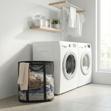 超写实主义风格,主色调为纯净的白色、浅灰色与原木色,柔和自然光从侧上方洒入,形成细腻的高光与浅淡阴影,展现光滑的瓷砖地面反射质感、洗衣机的现代塑料与金属光泽、藤编篮的自然纹理。画面中央是白色滚筒洗衣机,正面圆形透明视窗,顶部放置着简约瓶罐,左侧地面有装满白色毛巾的圆形藤编篮,旁边是一株绿色植物。背景改为明亮的现代厨房,白色哑光橱柜与浅色大理石台面,右侧搭配原木色开放格置物架,整体构图保持对称平衡,营造洁净、有序、温馨的家居氛围,视觉层次分明,信息传达简洁高效,符合现代家居产品展示的设计感。