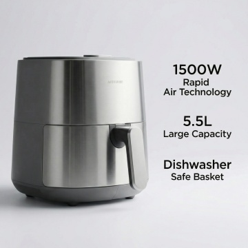 现代感与科技感交融的厨房场景,金属风电饭煲置于大理石台面,搭配清新果蔬与轻拟物设计,营造简约主义下的清爽舒适氛围。
