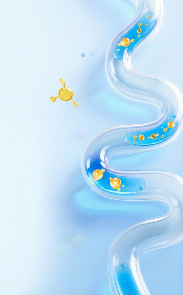 3D渲染风格的护肤品精华液广告海报,画面整体变换为以清新的蓝色调为主,搭配透明的水感白色,营造纯净科技的氛围。中央是一个透明的球形精华液胶囊,内部可见清晰的分子结构和悬浮的小气泡,周围环绕着流畅规整的液体波浪线条,波浪呈对称的弧形排布,大小不一的透明气泡均匀分布在画面中,整体构图平衡有序,光影柔和,高光表现细腻,液体质感通透富有光泽,视觉层级清晰,突出产品的科技感与纯净特质,信息传达高效,符合高端护肤品的目标受众审美。
