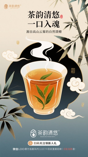 淡雅中国风插画风格,四个不同样式的青瓷茶杯,杯身分别饰有山水、花鸟、书法、缠枝莲纹样,温润通透的白瓷底色,青绿色调清新雅致,柔和的光影效果,杯内盛有淡绿色茶汤,杯口飘散着袅袅热气,周围点缀着新鲜的翠绿茶叶,叶片上带有晶莹的露珠,整体构图疏密有致,营造出宁静自然的茶文化氛围,线条细腻流畅,色彩过渡柔和,具有传统工笔画的细腻质感和现代插画的简洁美感,背景为纯白色。
