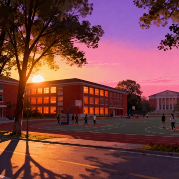 中景仰拍视角,现代风格校园建筑群沐浴在清晨金色阳光中,主体为红砖钟楼式教学楼主楼与红砖连廊式教学楼组合,左侧配银灰色金属质感实验楼,白色校门位于中央广场,门前有几何形绿化带、成排梧桐树及石板道路,天空湛蓝点缀絮状白云,阳光透过树叶形成斑驳光影,地面有黄色校车、骑行学生及步行师生,钟楼顶部时钟指向8:00,教学楼玻璃幕墙反射着天空与树木,建筑细节包括红砖砌法纹理、金属窗框线条和浮雕校徽,色彩以砖红色与灰白色为主调,点缀绿色植物,构图采用三分法,前景有晨读学生剪影,中景建筑群形成明确透视,背景是城市天际线,整体呈现明快而庄重的学术氛围,写实主义风格,空间纵深感强烈。