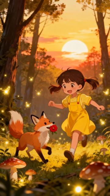 Studio Ghibli style female character, 20 years old Chinese girl, large expressive eyes like Totoro's Mei, round cute face, small nose, soft features, shoulder-length black hair with bangs, slender neck, petite but proportional figure, wearing light beige turtleneck sweater and denim overalls, red apron, hair tied in low ponytail with loose strands, cheerful expression, warm smile, hand-drawn animation character design, Miyazaki heroine aesthetic, full body,Ghibli soft watercolor style