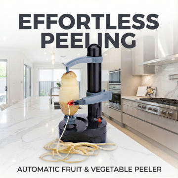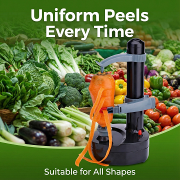 以图中的电动削皮器为元素,自动水果蔬菜削皮机,设计4张跟电动削皮器有关的广告图,英语,比例 「1:1」
