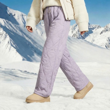 雪域实景中,浅紫绗缝裤搭配米白毛绒外套,柔雾质感与时尚廓形交织,营造舒适清新氛围,展现冬季潮流穿搭美学。