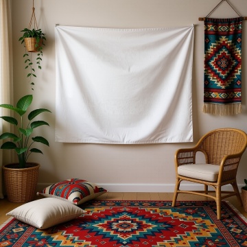 图中的横幅挂在客厅沙发后靠着的墙壁上,正视