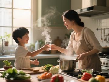 温馨治愈系插画,康养中心食堂墙绘。画面中央是一张原木餐桌,桌上有冒着热气的鸡汤、清蒸鱼、时令蔬菜,食物色彩柔和自然。一位面带微笑的女护理员正为一位慈祥的老奶奶盛汤,奶奶笑容满足。背景是温暖的米黄色墙壁,窗台有绿植。整体光线柔和温暖,光影斑驳,营造出安静、安心、如家庭聚餐般的温馨氛围。人物表情生动自然,笔触细腻。色调以暖米色、原木色、食物本色为主,点缀柔蓝色 红色和绿意。