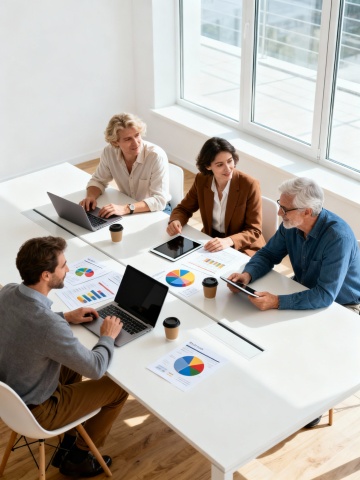 从正上方俯拍的不同工作场景,明亮柔和的自然光从上方洒下,营造专业、高效、协作的办公氛围。现代简约风格的办公桌,表面整洁有序,几位身着正式商务西装(深色与浅灰色系搭配)的职场人士正专注于各自的工作。桌面上散落着文件、笔记本、数据报表、黑色水笔,以及打开的笔记本电脑和平板电脑,旁边摆放着黑色咖啡杯。画面中可见多只正在书写、指点文件或操作电子设备的手,展现不同工作状态下的专注与忙碌,整体色调以黑白灰为主,干净利落,构图均衡,细节清晰,光影过渡自然,体现现代职场的专业感与高效协作的工作背景。