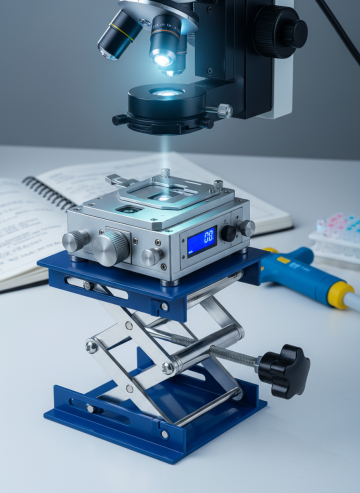 简洁的实验室环境,一个微型升降架用于支撑和微调一个小型光学传感器的高度,旁边连接着纤细的数据线,背景干净,冷色调照明,体现科技与精确感。 比例3:4