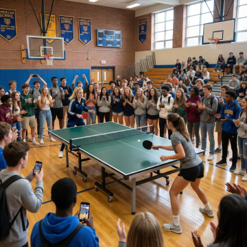 图片要正方形 换场景 在美国学校校园里 有两个外国老师打乒乓球 桌子上有飞起的乒乓球 旁边有其他打乒乓球的外国人