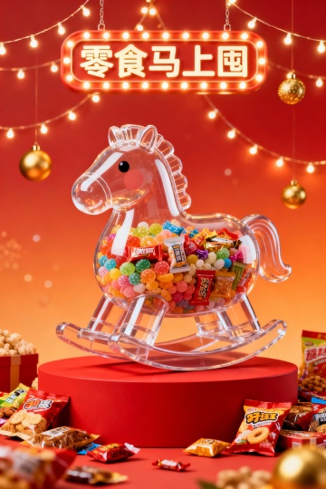 写实风,轻微仰拍视角,主体位于画面中心,被小马造型的夹子在一根麻绳上,主体占画面比60%,保持主体特征不变。高饱和暖色调,红色渐变背景(鞭炮、中国结、金色彩带装饰),清新趣味感氛围,顶部主标题为3D红橙金配色标题“加马年货节”(骑马小人装饰),副标题位于主标题下方(3D小字文本框“1·1~2·30 会员折上折”)。