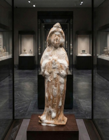 高博物馆展柜内,一个升降台将一件小型青铜器从下方安全舱中平稳升起,供游客参观,科技与历史结合 比例3:4