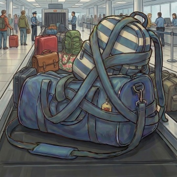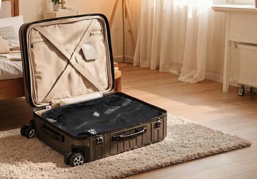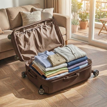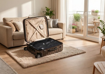 一个打开的绿色行李箱,内部整齐地铺着白色衬布和绿色条纹衣物,旁边放着白色眼罩、绿色方块物品,行李箱外散落着米色皮质收纳包、黑色相机、米色笔记本、白色太阳镜、草帽、香水瓶、口红、黑色小皮件和印有飞机图案的蓝色卡片,整体采用简约清新的摄影风格,明亮柔和的自然光从上方照射,形成清晰自然的阴影,色调以绿色、米色、白色为主,营造出轻松愉悦的旅行氛围,画面构图讲究,物品摆放有序,具有强烈的生活美学感和精致的收纳展示效果。