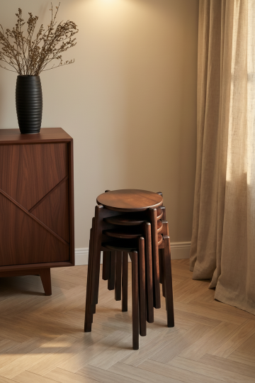 极简主义风格桌面背景,浅原木色实木桌面,搭配不同配色的简约布艺靠椅,柔和自然光透过百叶窗在浅米色墙面上投下整齐的光影条纹,桌面上摆放着不同场景的精致摆设,整体呈现温馨宁静的氛围,光影层次丰富,色调和谐统一,质感细腻真实,构图简洁大方,适合作为桌面背景使用。
