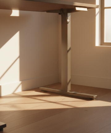 特写放大会议桌脚架,阳光勾勒桌腿,整体色调温馨和谐,电影质感,角落光影交织,温暖氛围拉满,超高清画质