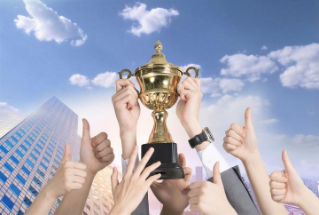一张简约现代风格的素材图,纯色背景,中央位置规整排布着一个金色奖杯图案。奖杯具有光滑的金属质感,顶部为五角星造型,下方连接着优雅弯曲的金色支架,底座为深棕色六边形,整体光影过渡自然,高光和阴影细节清晰,设计简洁而富有立体感。