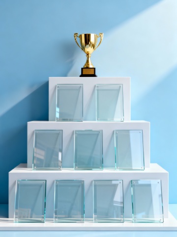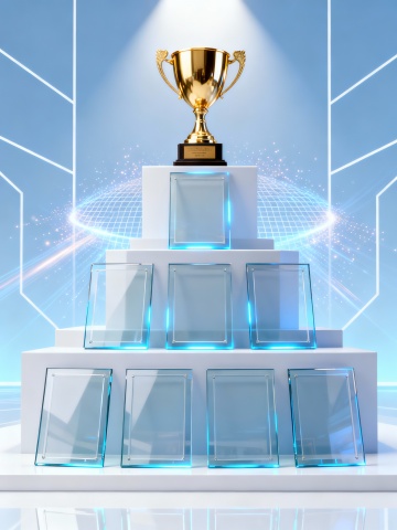 帮我生成一张证书展示的详情页页面,页面上有4层展台,9个玻璃相框。展台第1一层放4个展示证书的玻璃相框,展台第2层放3个展示证书的玻璃相框,展台第3层放2个展示证书的玻璃相框,最高的展台上要放1个奖杯,奖杯要比较突出,页面整体为浅蓝色为主白色为辅,要有科技感的背景,有光线照射,整体正面朝前,玻璃相框都为竖着排列,图片比例3:4