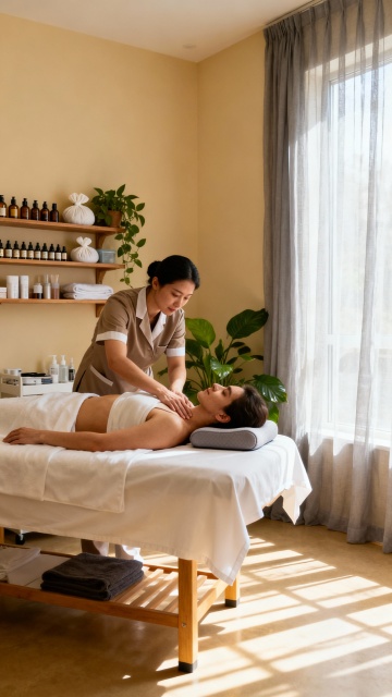 一个外国美女趴着做水疗场景,美女闭眼享受,旁边桌还放着香薰