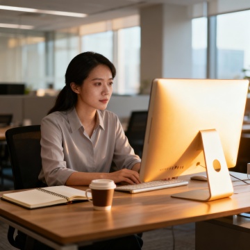 明亮的现代办公室环境,柔和的自然光透过大面积玻璃窗洒入室内,温暖的木质办公桌,桌上放着笔记本电脑、打开的笔记本、蓝色马克杯和一支铅笔,穿着米色开衫与白色衬衫的女性正在专注地使用笔记本电脑,背景有白色书写板、木质书架和简约办公家具,整体风格简约、专业、温馨,具有清晰的空间层次感和舒适的工作氛围,高清晰度,写实摄影风格,柔和光线,自然色彩。