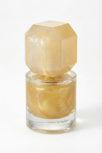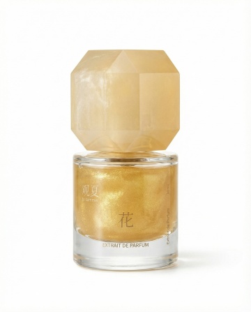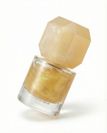 鎏金风与玻璃风交融,金属瓶盖折射柔和光影,干花飘浮于琥珀色背景,营造奢华优雅的唯美感,重拟物手法强化质感与实景感。