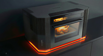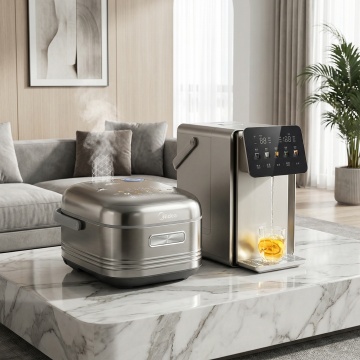 现代感与科技感交融的厨房场景,金属风电饭煲置于大理石台面,搭配清新果蔬与轻拟物设计,营造简约主义下的清爽舒适氛围。