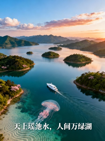 - 万绿湖:碧水如玉,星岛棋布,青山环抱,游船泛波,蓝天白云,桃花水母,日出/日落柔光,航拍视角
