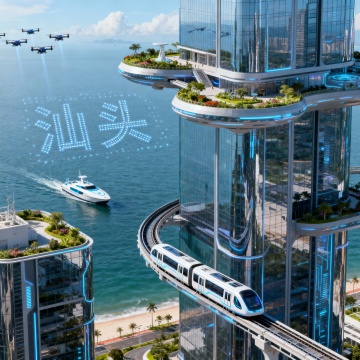 1. 主次分层构图(推荐):以万绿湖碧波为画面基底,左侧嵌入客家围屋剪影,右侧叠化恐龙骨架与未来科技建筑的虚实结合,底部点缀客家美食与青年创客的小元素,光影从日出暖光过渡到科技冷光,体现“古今交融,生态赋能未来”。