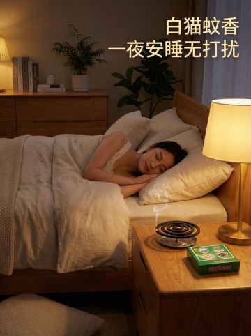 暖光轻雾萦绕,木雕风床头柜上简约加湿器静置,柔光透帘,营造冬日温馨实景感,轻拟物设计呼应自然舒适。