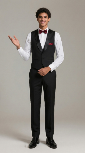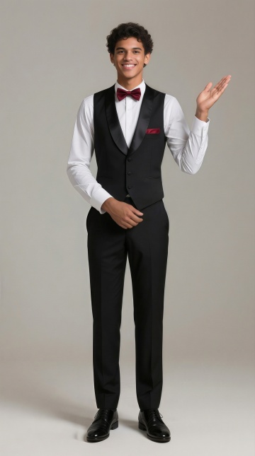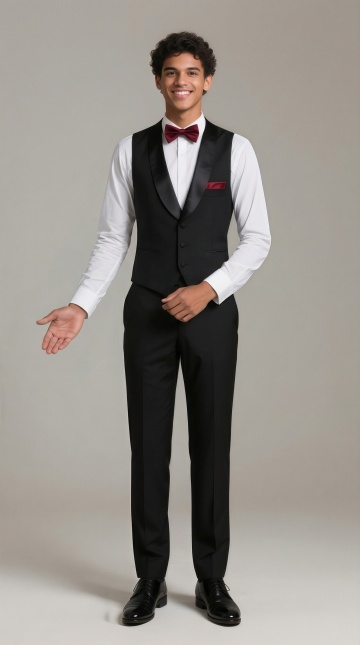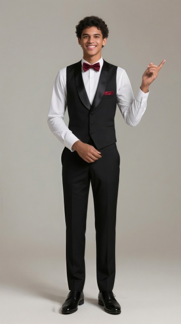 2. 纯黑色西装搭配白色衬衫,酒红色底金色斜条纹花纹领带,纯色背景,专业商务风格,清晰的服装剪裁细节,平滑的面料质感,正面展示,无头模特