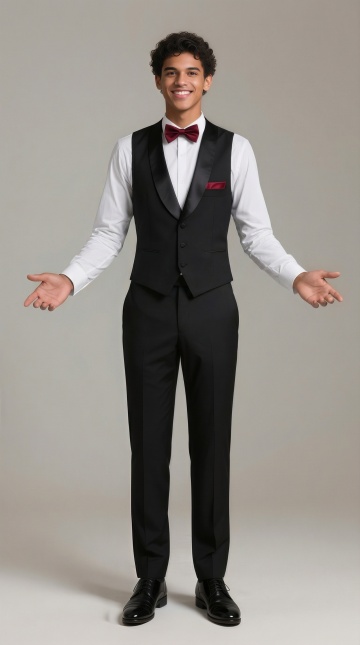 5. 纯黑色西装搭配白色衬衫,黑色底银色细格纹花纹领带,纯色背景,专业商务风格,清晰的服装剪裁细节,平滑的面料质感,正面展示,无头模特