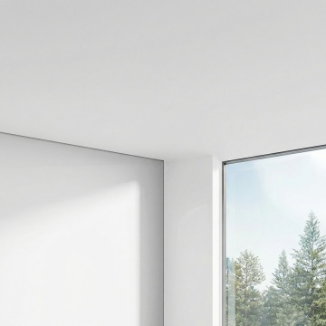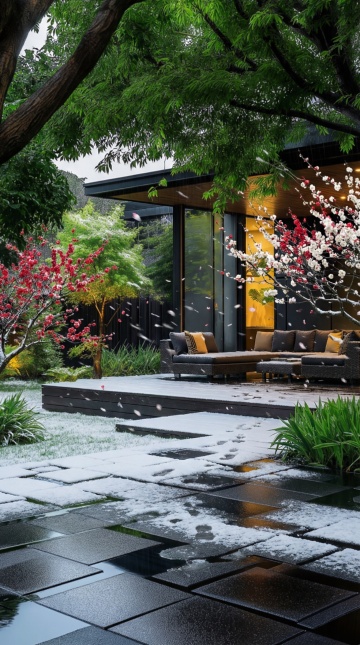 现代简约风格庭院,木质墙面的遮阳棚下,摆放着浅灰色L形沙发配多个米色与棕色靠垫,沙发前有圆形小茶几和两个圆形脚凳,左侧是白色户外吧台,右侧放置黑色烧烤架,地面为浅灰色石板,前方是修剪整齐的绿色草坪,周围环绕茂密绿树,枝叶从上方垂下,阳光明媚,天空湛蓝有少量白云,整体氛围宁静舒适,光影清晰自然,呈现出温馨惬意的户外休闲空间。