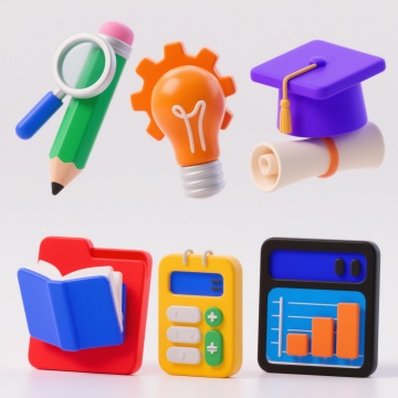 6个不同配色、不同样式、不同材质的教育元素(如书本、铅笔、地球仪、放大镜、计算器、文件夹等),每个元素具有清晰的3D立体效果,表面光滑有光泽,带有细腻的高光和柔和阴影,白色背景,元素排列整齐有序,呈现出简洁、专业的教育主题氛围。