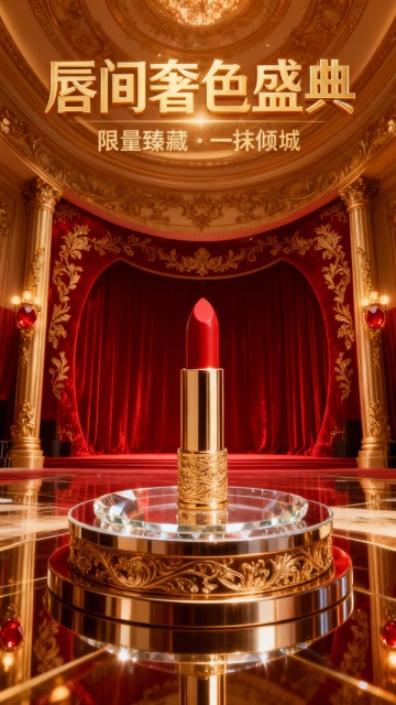 写实风,奢华感,主色调为高饱和亮红搭配奢华金色,舞台下方仰视视角。主体位于舞台上的双层金属圆形展台上(占30%视觉比例),顶部暖色聚光灯投射于主体,背景为垂坠感红色丝绒幕布(装饰金色走线),两侧装饰华丽金马造型欧式石柱(前景左右对称)。画面上方为3d金属细体亮金色文字“年度爆品表彰大会”,副标题金属小字“全网销量300w+”。