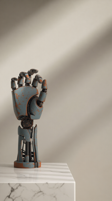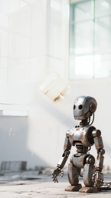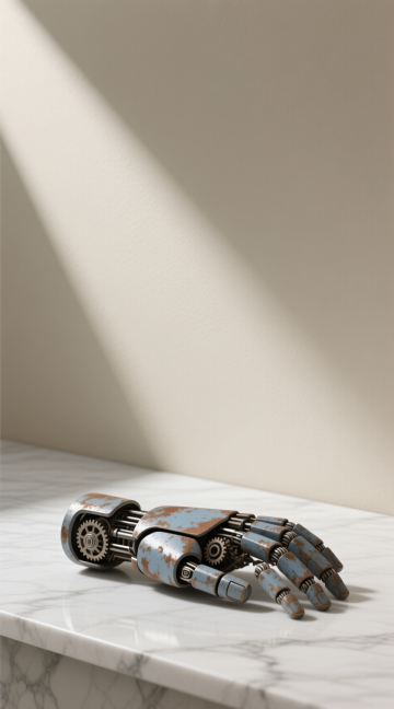 Vertical poster layout, a single 3D object in the center: a rusty, heavy metal robot hand or head, looking clumsy and old-fashioned, realistic textures of scratched metal and oil leaks, soft studio lighting, clean white or light beige background, high contrast, minimalist composition leaving plenty of room for text, 8k resolution --ar 9:16 --v 6.0