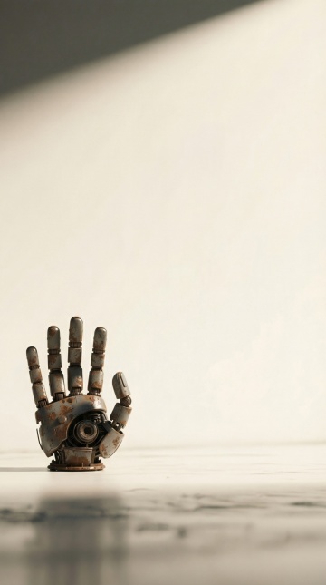 设计思路: 生成一个孤立的、稍微有点生锈或破旧的机器人关节或头部,放在纯净的背景上。这种强烈的对比能瞬间传达“Clanker”那种笨重、非人的特质。