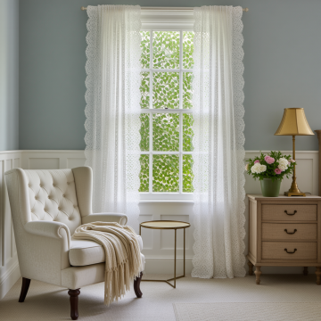 极简主义水彩风格室内场景,柔和的灰蓝色墙面,白色透光纱帘垂落于窗框两侧,窗外是淡蓝色天空与稀疏白云,窗边浅木色腿白色抽屉柜上摆放透明玻璃花瓶,插满白色花朵,地面铺浅灰色地毯,整体色调清新淡雅,光线柔和明亮,营造宁静通透的氛围,线条简洁流畅,色彩晕染自然,保留水彩特有的轻盈通透质感与微妙笔触纹理。
