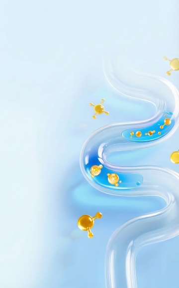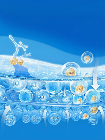 高透明感3D渲染的益生菌细胞结构,多个半透明蓝色球体悬浮在纯净的浅蓝色背景中,球体内部有更小的蓝色圆形结构,表面附着细小气泡和水珠,周围环绕着流动的透明水波纹和散落的微小蓝色光点,整体呈现出科技感与纯净感兼具的微观世界视觉效果,光线柔和从上方照射,形成细腻的高光和轻微阴影,营造出清新、健康、活力的氛围。