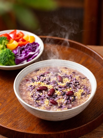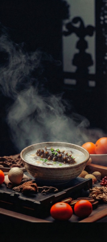 国潮风与重拟物结合,鎏金浮雕纹饰碗盛腊八粥,红金主色营造喜庆中式感,枝头挂饰与灯笼呼应节日氛围,传递浓郁复古年味。