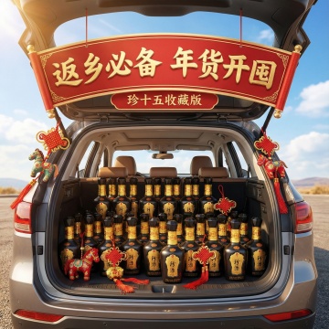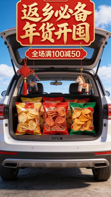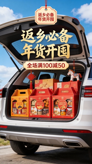 3D写实风,中景,视觉中心是一辆suv车的后备箱。主体被复制多个堆满后备箱(占画面比40%)。后备箱装饰中国结、布艺小马挂坠等过年元素。背景为户外蓝天白云,顶部喜庆感吊牌文本框中展示鎏金毛笔大字“返乡必备 年货开囤”,副标题位于主标题下方展示文字“全场满100减50”,突出春节氛围感。