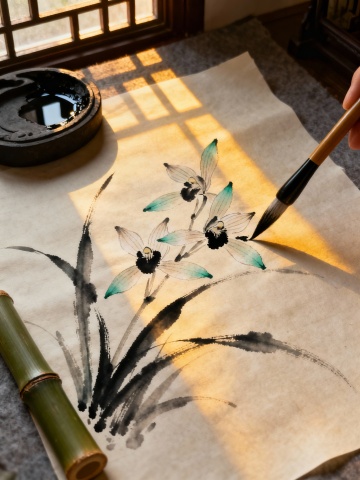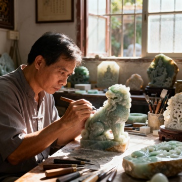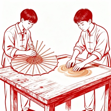 特写镜头,展现一双巧手正在进行创作。一只手用金线在深蓝色的丝绸上绣出玉兔望月的图案,针脚细密,光泽流动。另一只手则在制作一幅结合了剪纸和皮影的艺术品,红色的长城剪纸作为背景,一个半透明的玉兔皮影置于其上,背后有暖黄色的灯光透出,形成迷人的光影效果。背景中,桌面的一角可以看到螺钿漆器闪烁的碎片光芒。整个画面构图精致,充满手作的温暖和古老工艺在现代被唤醒的感动。