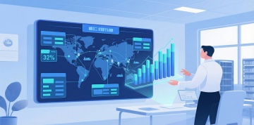 3D风格的宣传界面,画面的主体居左,主体是一个带有图表、数据模块等元素的白色立体分层面板,周围漂浮着蓝色统计图表形状物件,玻璃磨砂质感。画面右侧留白。整体色调以白色为底,搭配蓝色元素,背景是炫彩浅蓝色,呈现出简洁、现代、科技感的视觉效果