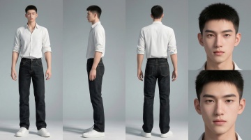 图生图模式,参考图为 18 岁男生林屿正面全身照,3D CG 风格,国漫审美,生成同一人物的标准三视图 + 面部细节特写图,四图排版整齐统一
