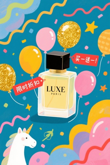 插画风扁平设计,融合卡通独角兽与气球元素,营造梦幻喜庆氛围,轻拟物香水瓶搭配孟菲斯风格色彩,节日促销感十足。