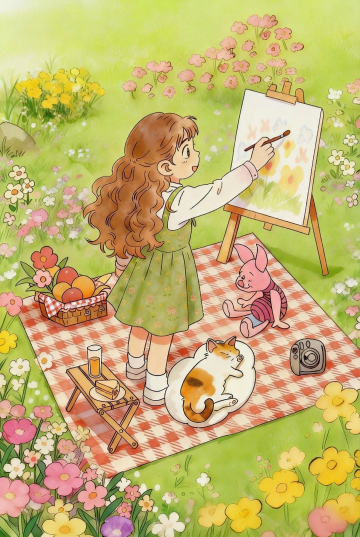 温馨柔和的插画风夜景,卡通女孩在灯下写手账,水彩质感营造舒适氛围,窗外星月点缀,尽显静谧与治愈。