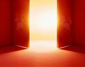 梦幻感插画风,剪影马奔向光门,光影交错,粒子点缀,超现实主义氛围,柔和色调中透出希望与自由。